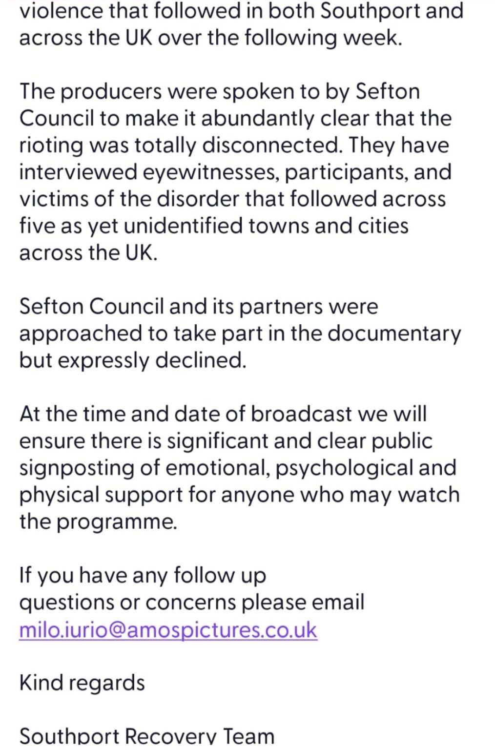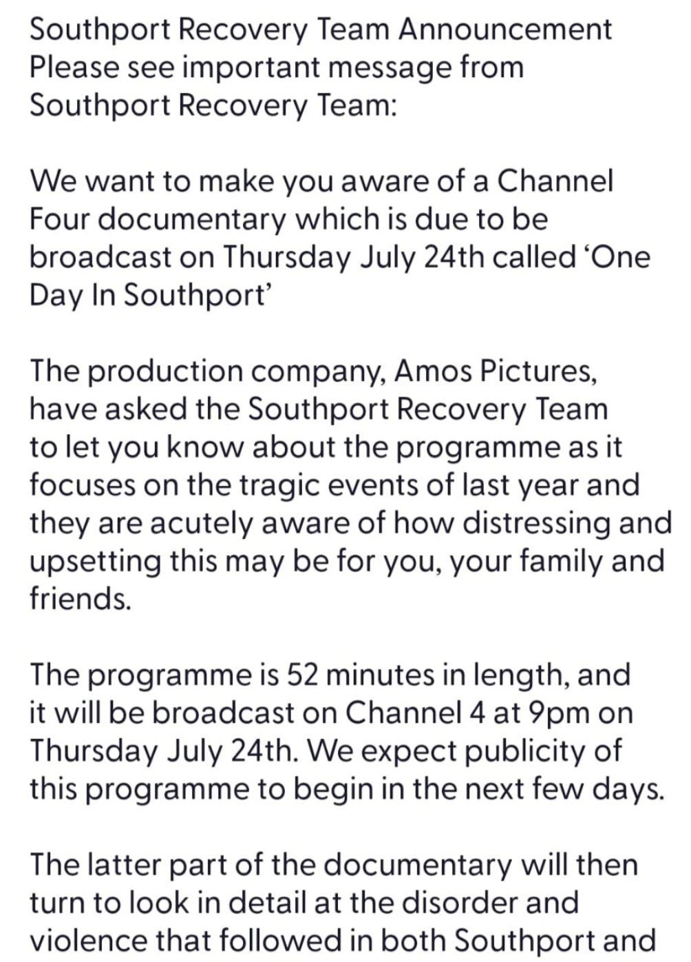 A message has been circulated in locals schools in Southport by the 'Southport Recovery Team' forewarning parents about a Channel 4 'Southport' documentary airing on Thursday 24 July 2025.